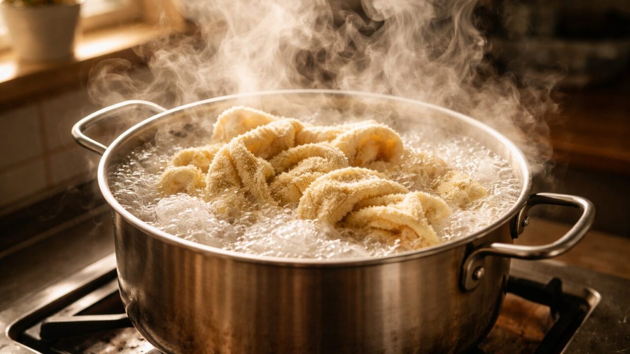 ただし、高温に耐えられない化学繊維(ポリエステルやナイロンなど)が含まれているタオルは変形や縮みの原因になるため、必ず「綿100%」のタオルで行ってください。手間はかかりますが、茹で上がったタオルのお湯が茶色く濁るのを見れば、その効果に驚愕するはずです。
