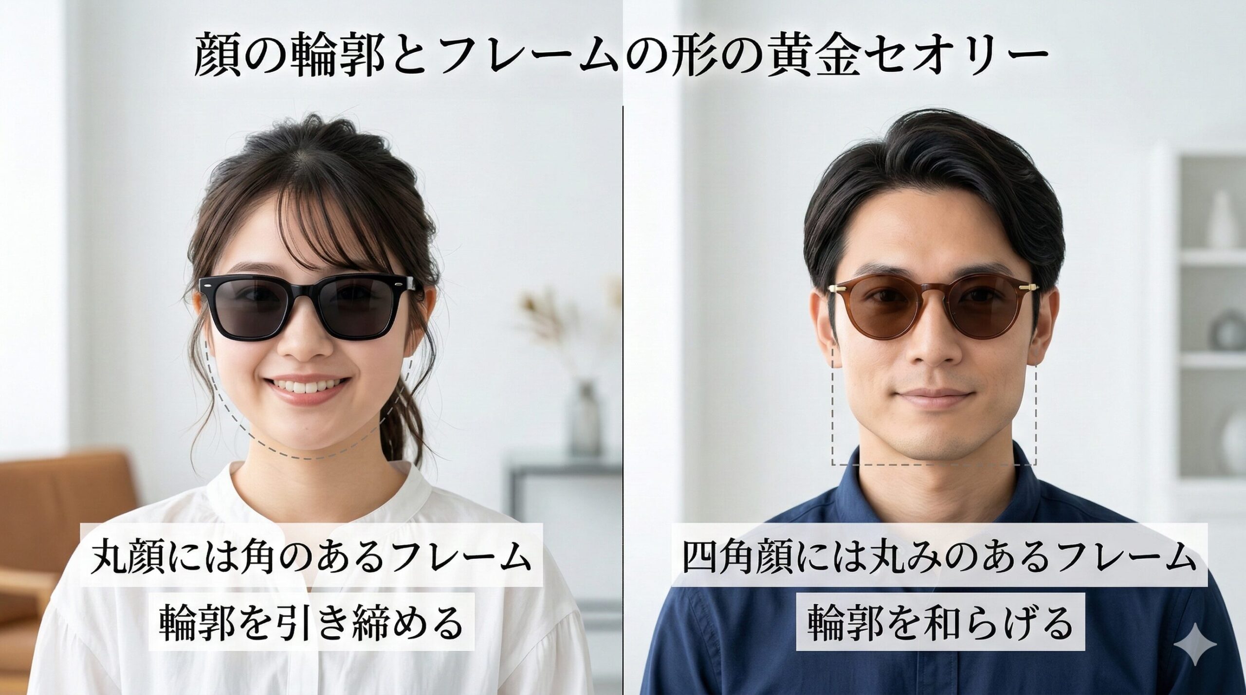 最も分かりやすく失敗が少ないルールは、「自分の顔の輪郭とは逆の形をしたフレームを選ぶ」というセオリーです。