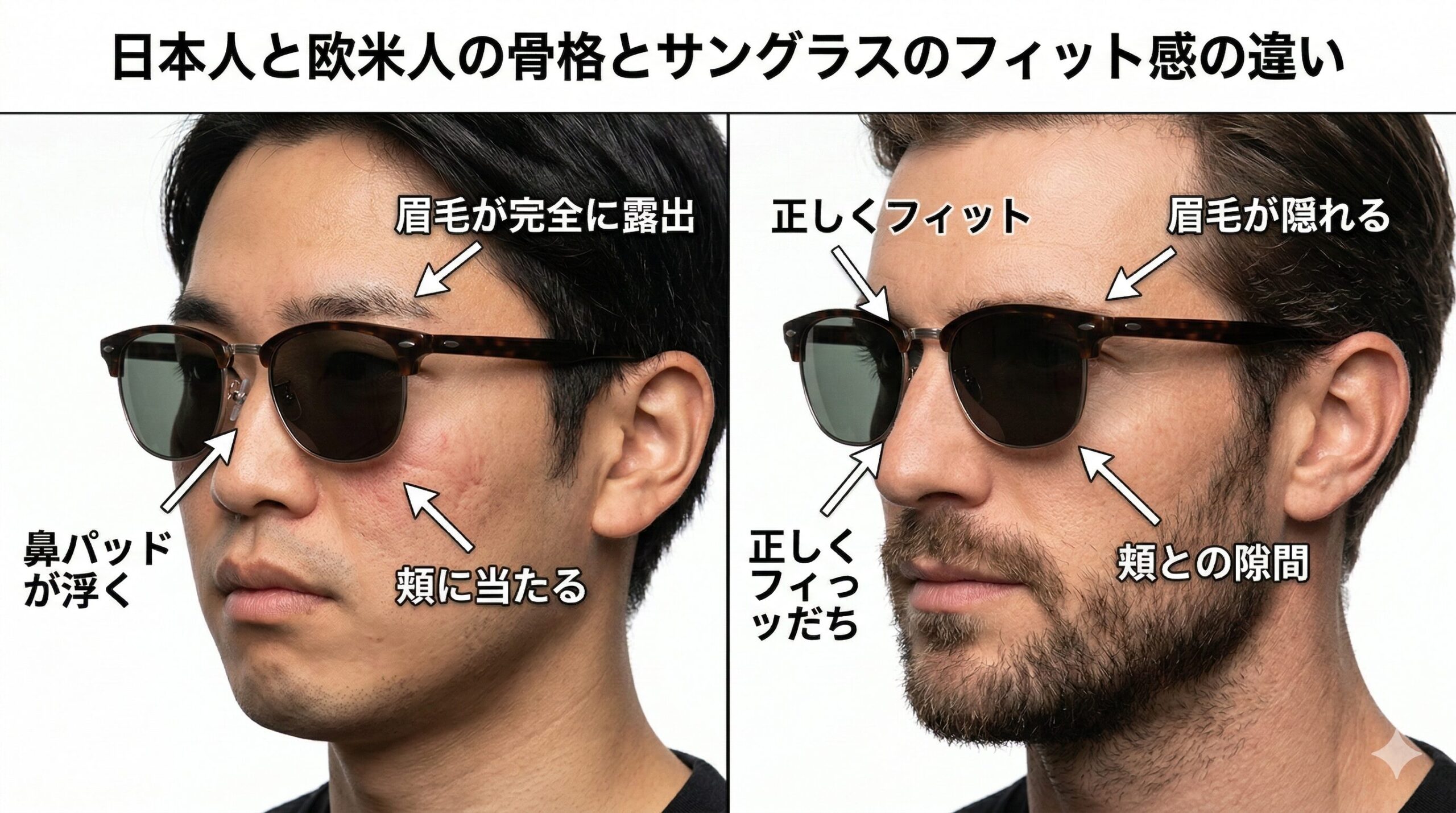 また、日本人は眉毛と目の距離が欧米人よりも離れている傾向にあるため、サングラスをかけた時にフレームの上から眉毛が完全に露出してしまいがちです。