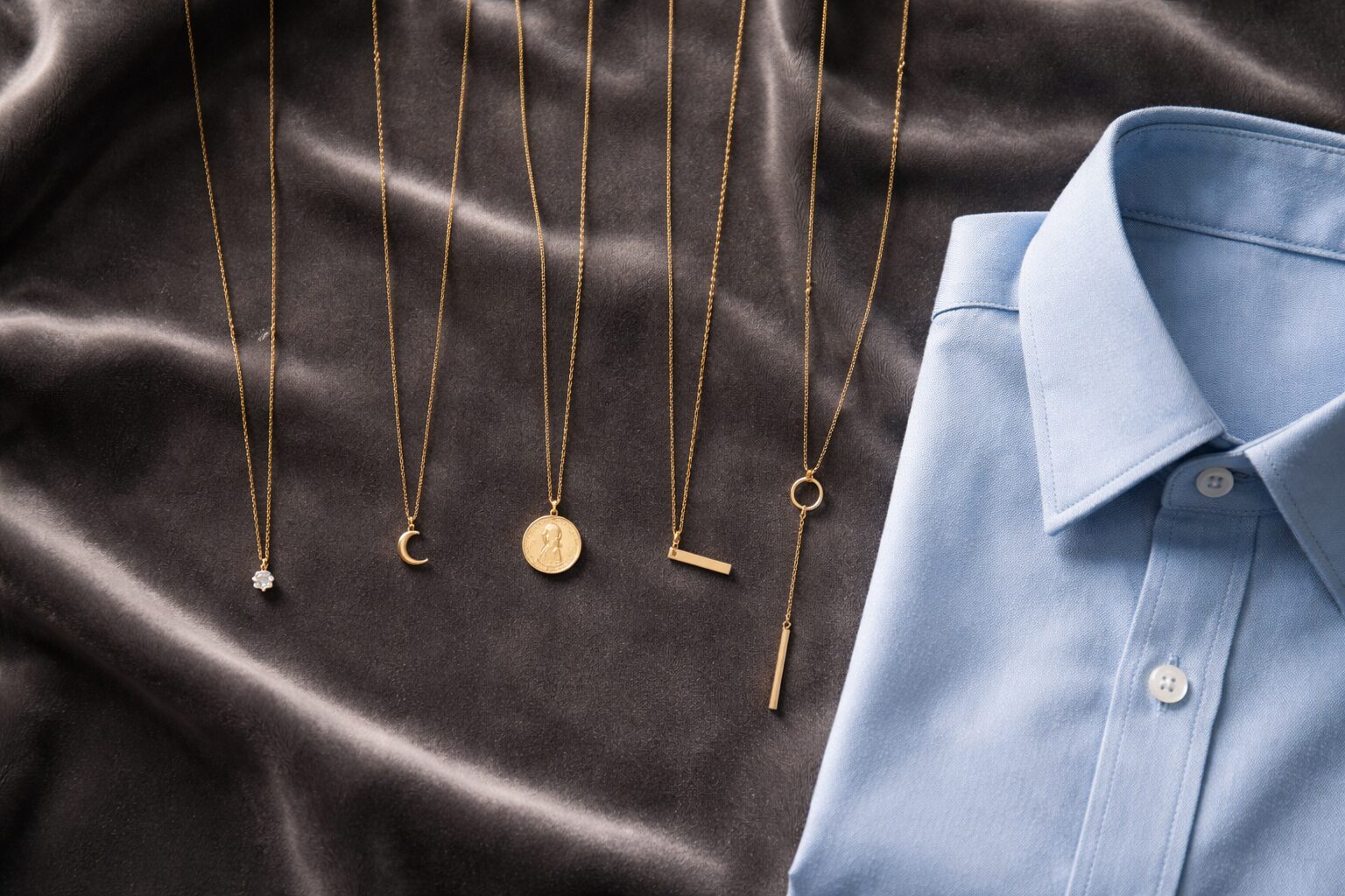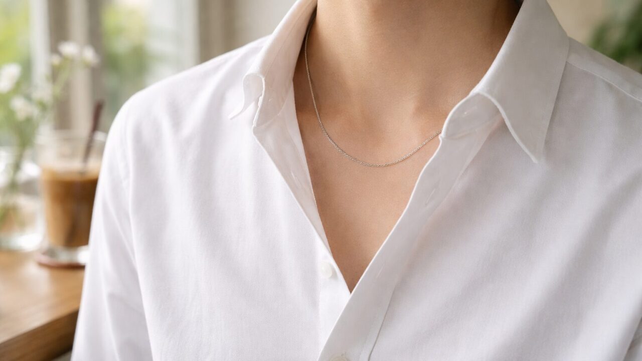 シャツにネックレスを合わせるのが難しいと感じる最大の理由は、襟の存在感とネックレスの主張がぶつかり合ってしまうからです。特に、レギュラーカラーの襟付きシャツを着たとき、中途半端な長さのチェーンを選ぶと、襟のラインとアクセサリーが重なってしまい、首元が非常にごちゃごちゃとした野暮ったい印象になってしまいます。これが時代遅れと言われてしまう大きな原因です。