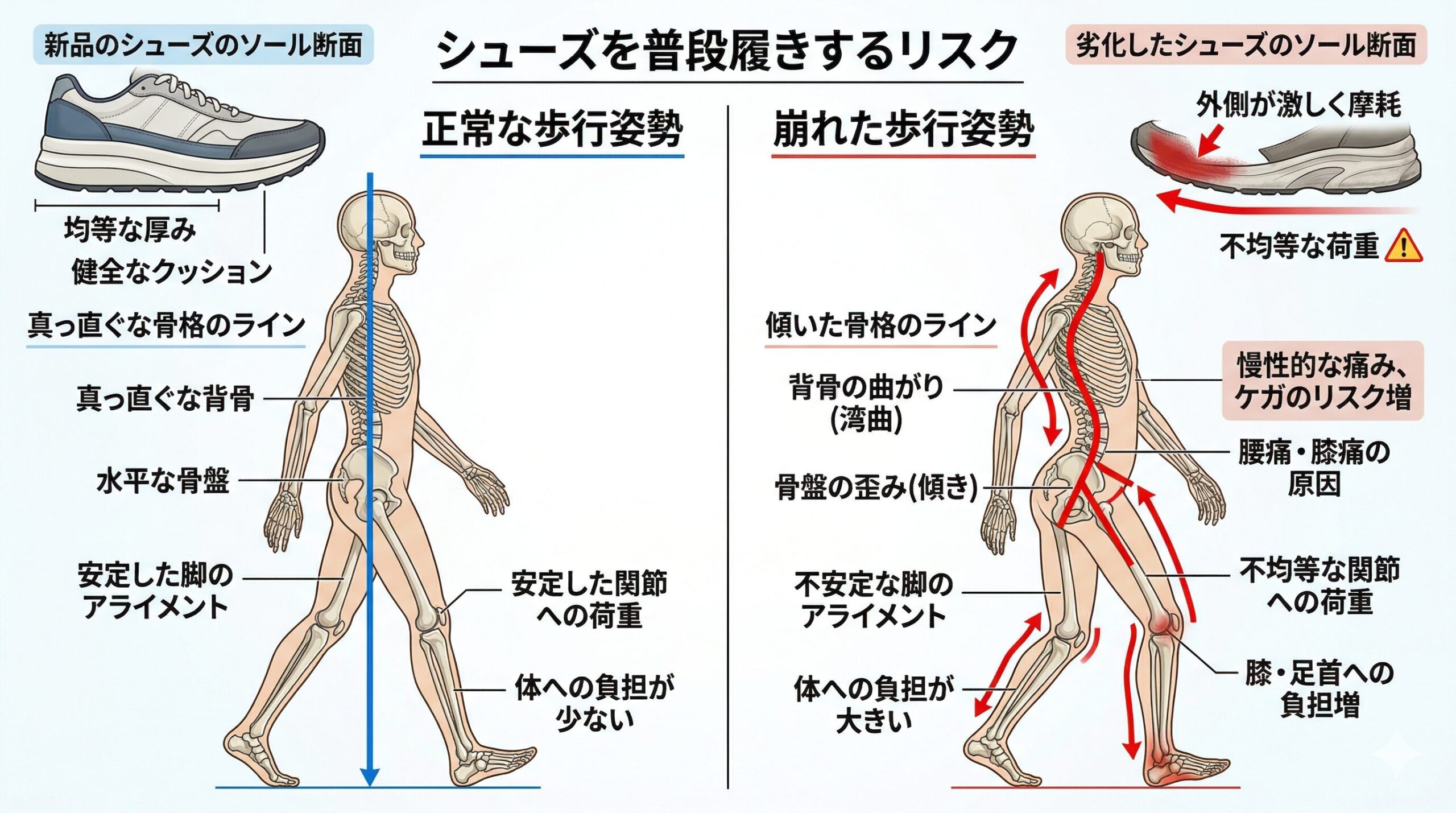 - 劣化したシューズの普段履きへの転用は歩行姿勢を崩す原因となる