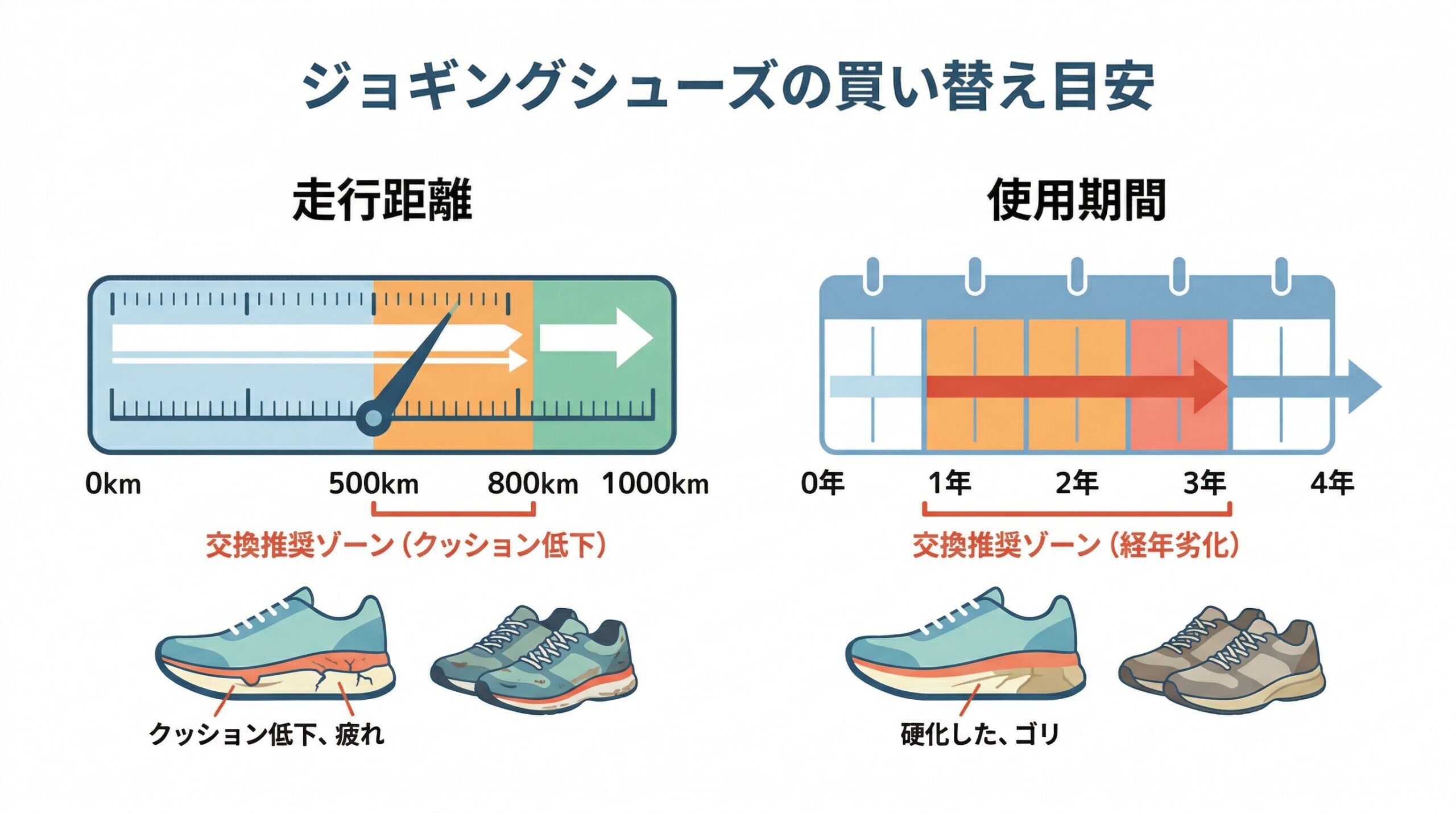 内部のミッドソールが潰れ、反発力が失われた状態のまま走り続けることは、膝や腰への深刻なダメージを蓄積させる原因となります。
