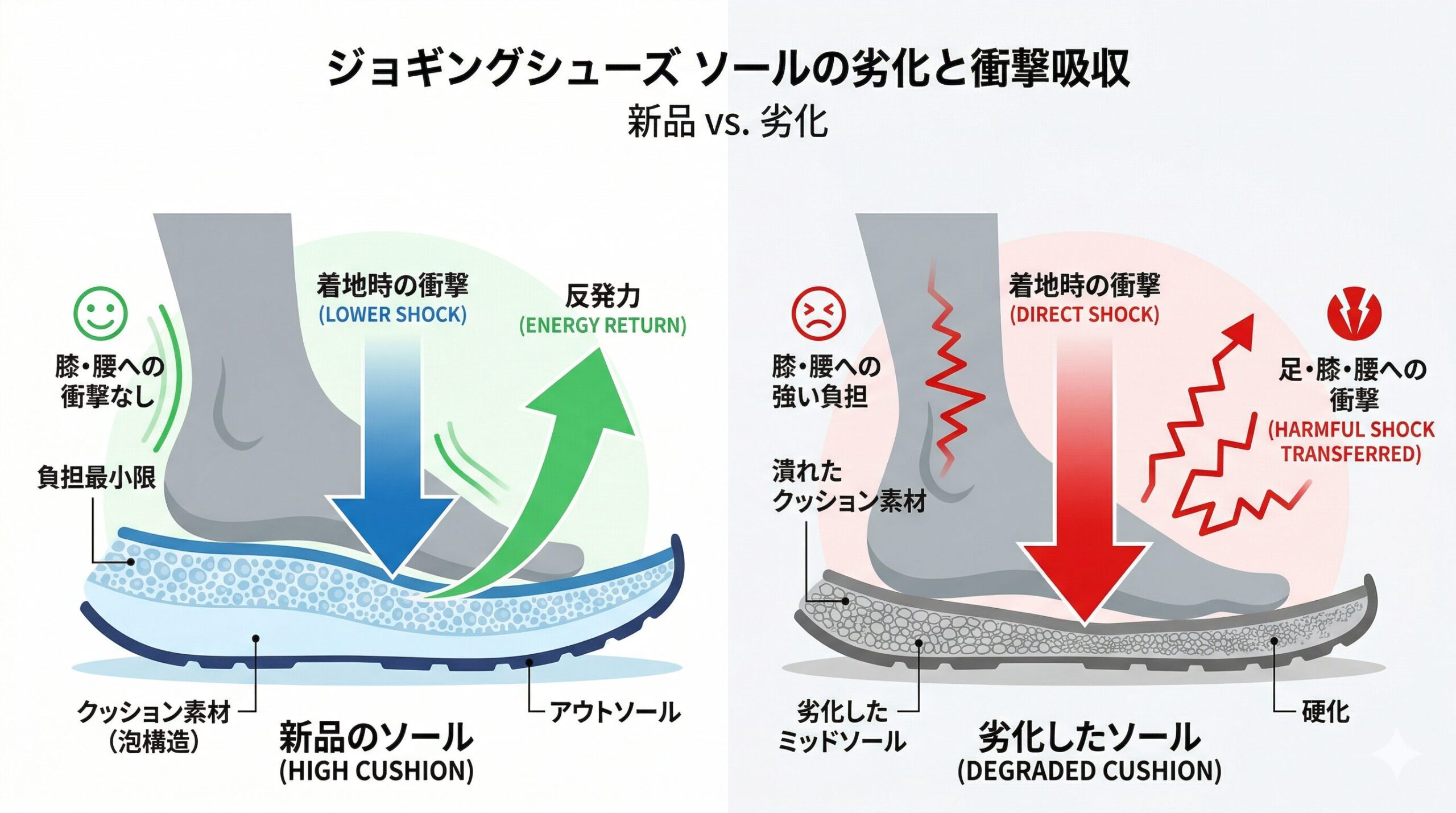 内部のミッドソールが潰れ、反発力が失われた状態のまま走り続けることは、膝や腰への深刻なダメージを蓄積させる原因となります。