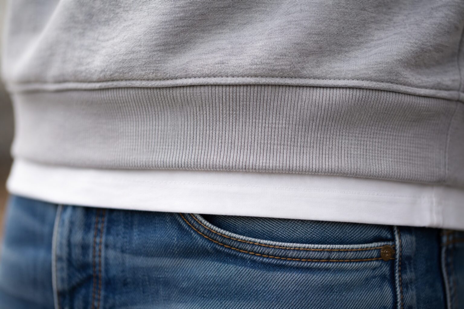 まずは手持ちのスウェットの下に、今回紹介した白Tシャツを一枚重ねてみてください。
