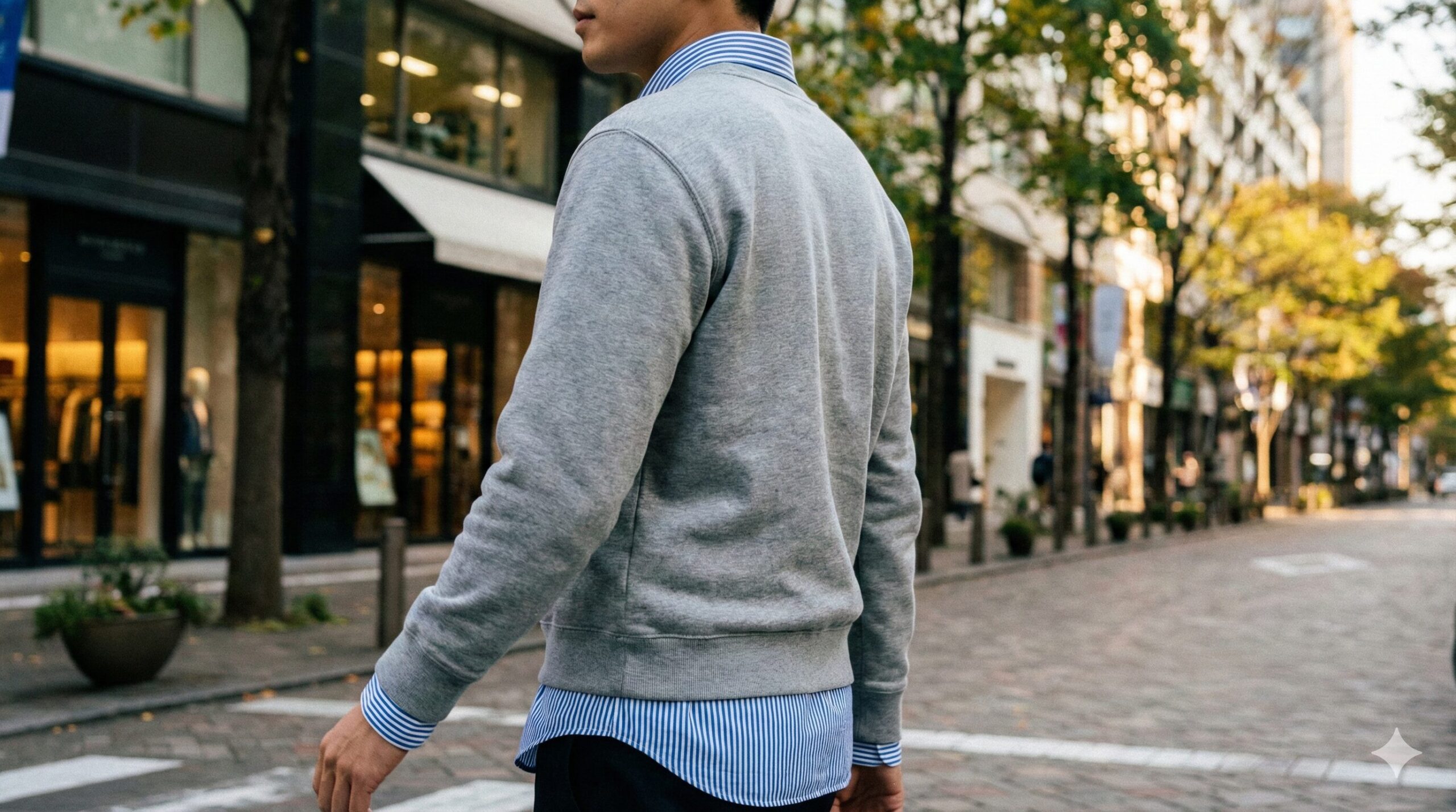 この「スウェットのインナーを見せる」テクニックは、簡単なようでいて、実は出す分量や素材選びを間違えると一気にだらしなく見えてしまう奥深いものです。