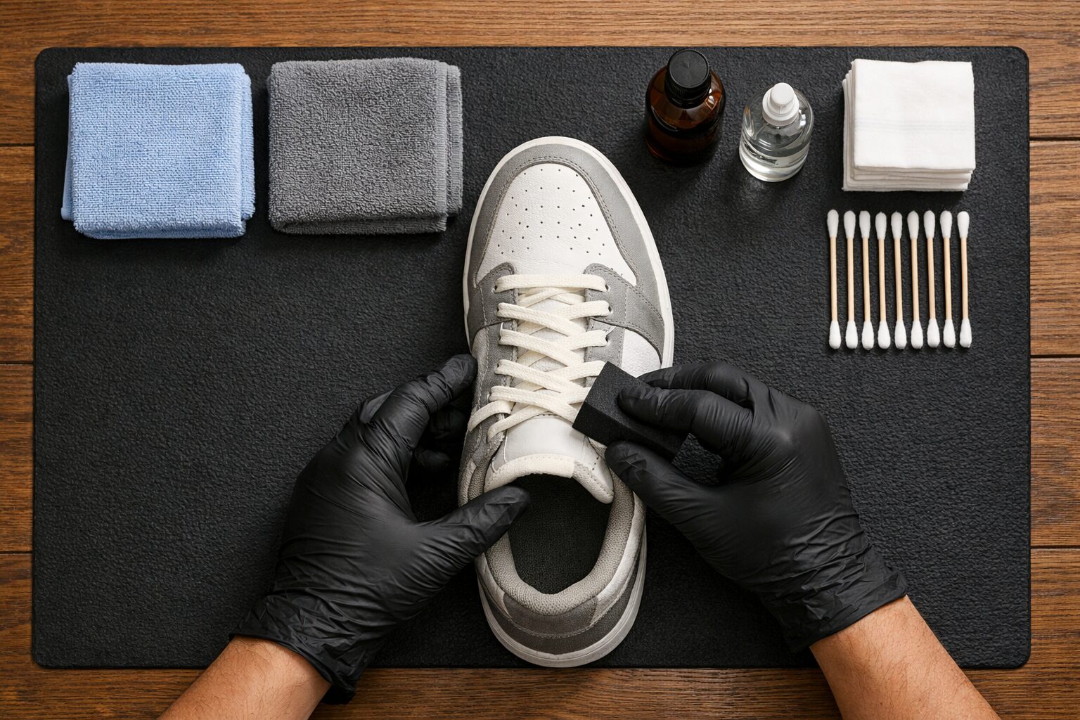 コーティングの効果を最大化するのは、**「箱から出した瞬間の新品」**の状態です。 一度でも履いて汚れや油分が付着すると、定着が悪くなります。 すでに履いている靴の場合は、スニーカー専用クリーナーできれいに洗い、 完全に乾燥(24時間以上)させてから施工しましょう。