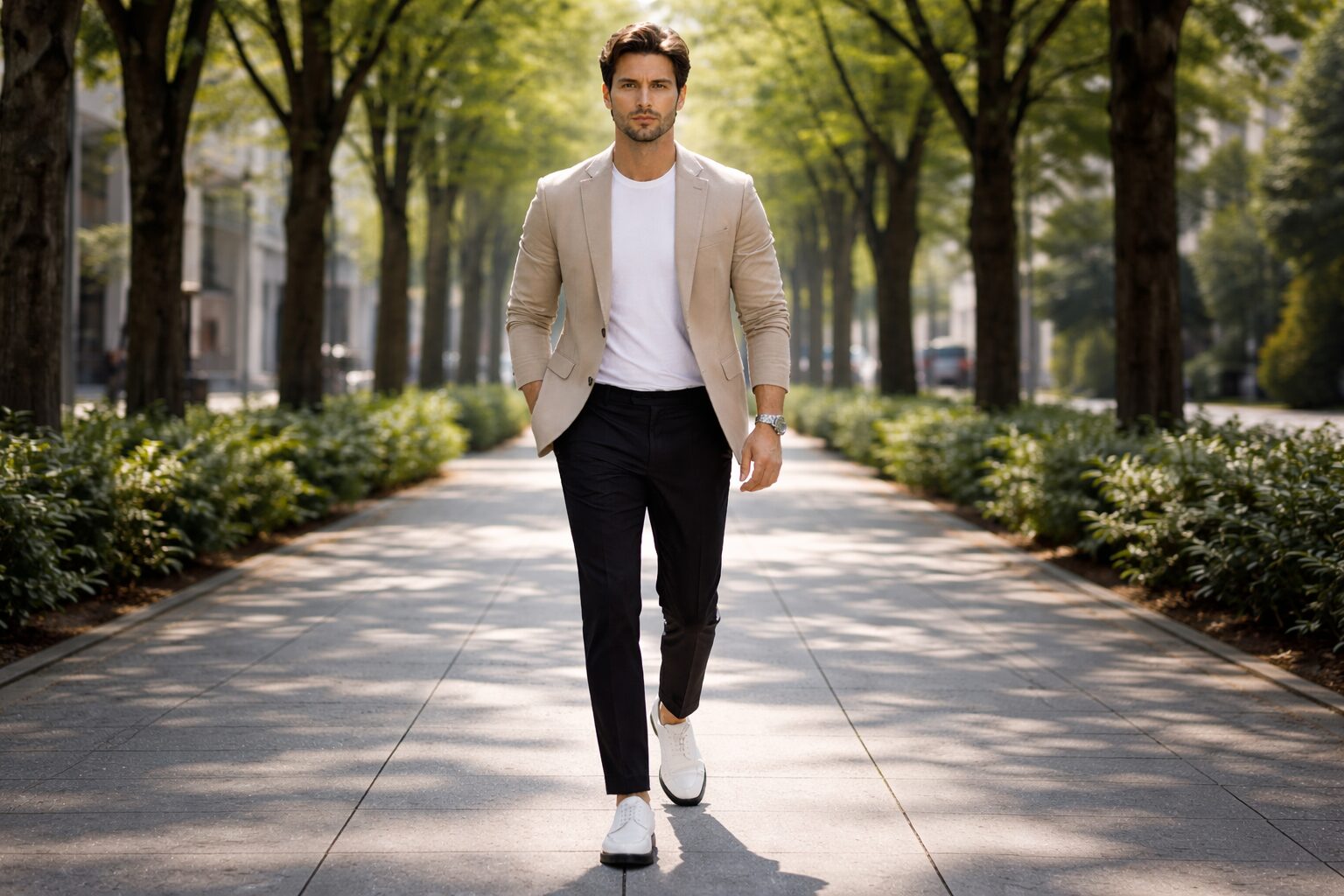 これを回避し、洗練された大人のスタイルに昇華させるための鉄則は、「ドレスライクなアイテム」とのミックスです。センタープレスの入ったきれいめなスラックスや、チノパン、あるいはセットアップのスーツの足元に、あえてこのクラシカルなスニーカーを合わせてみてください。かっちりとした服装に足元で「抜け感」を作ることで、ファッションを知り尽くした大人の余裕を演出できます。