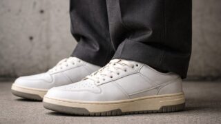 白スニーカー特有の「爽やかさ」や「抜け感」は出にくいため、夏のコーディネートに合わせると少し暑苦しく見えてしまうかもしれません。ですが、秋冬のダークトーンの服装や、モノトーンでまとめたモードなスタイルの足元には、これ以上なくハマる頼もしい相棒となります。