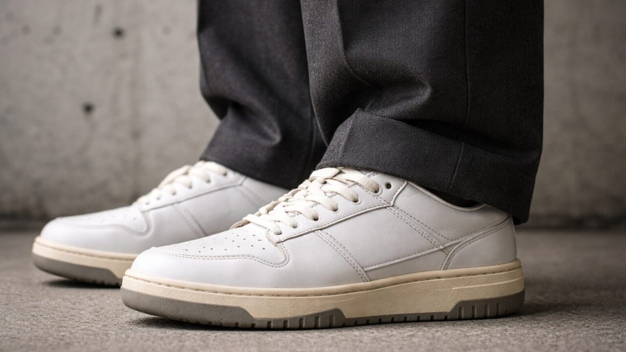 このカラーの最大のメリットは、圧倒的に汚れが目立ちにくく、天候を問わずにガンガン履き込めるという実用性の高さです。ブラックのスラックスや細身のジョガーパンツと合わせれば、足元がキュッと引き締まり、脚を長く見せるスタイルアップ効果も期待できます。
