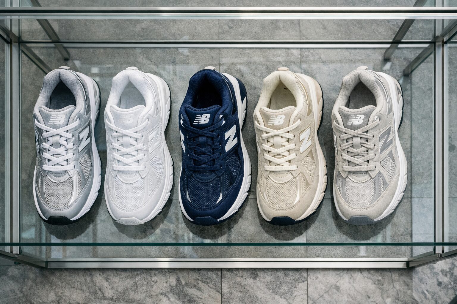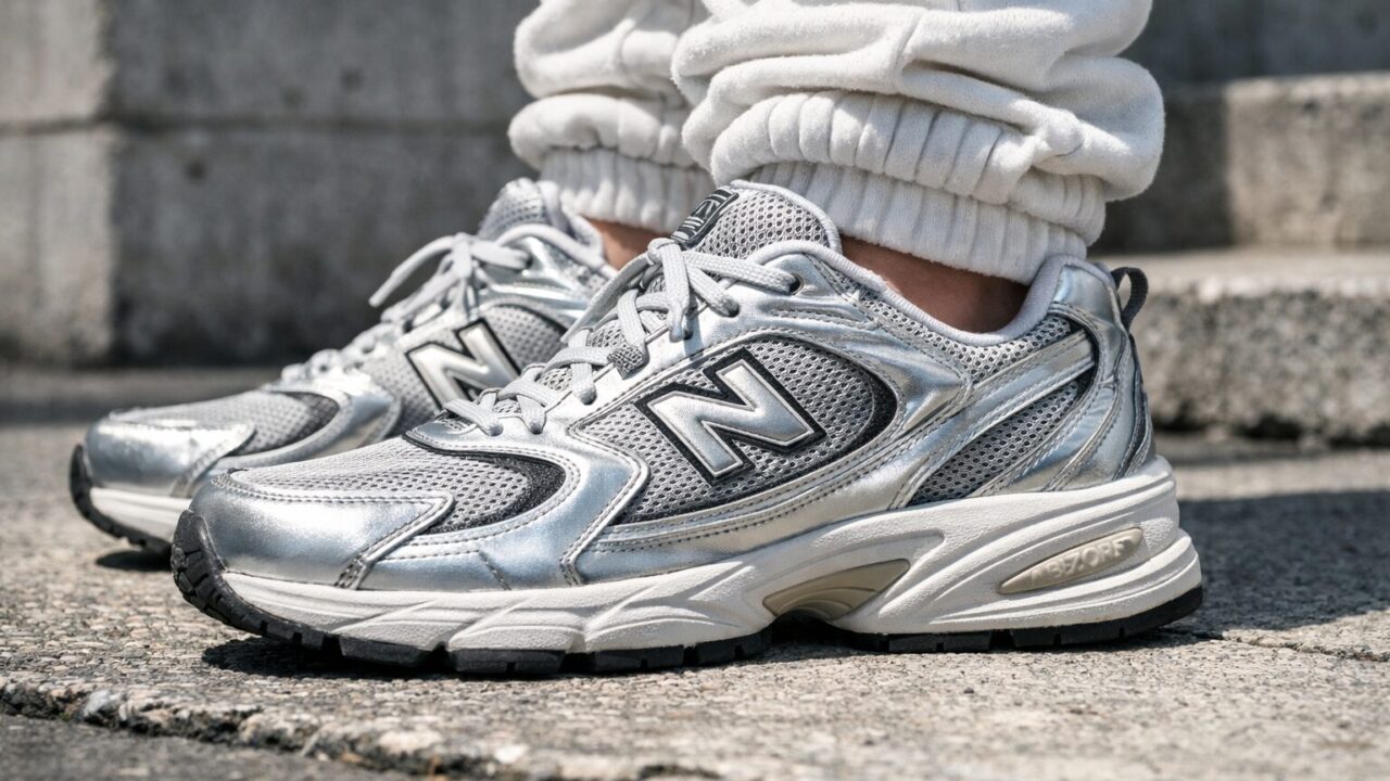 「Y2Kファッション」のムードを最も色濃く体現しているのが、全体にメタリックなシルバー素材を大胆に配置した「MR530 KA」です。光の当たり方で表情を変えるシルバーが、足元に強烈なインパクトと近未来的なエッジをもたらしてくれます。