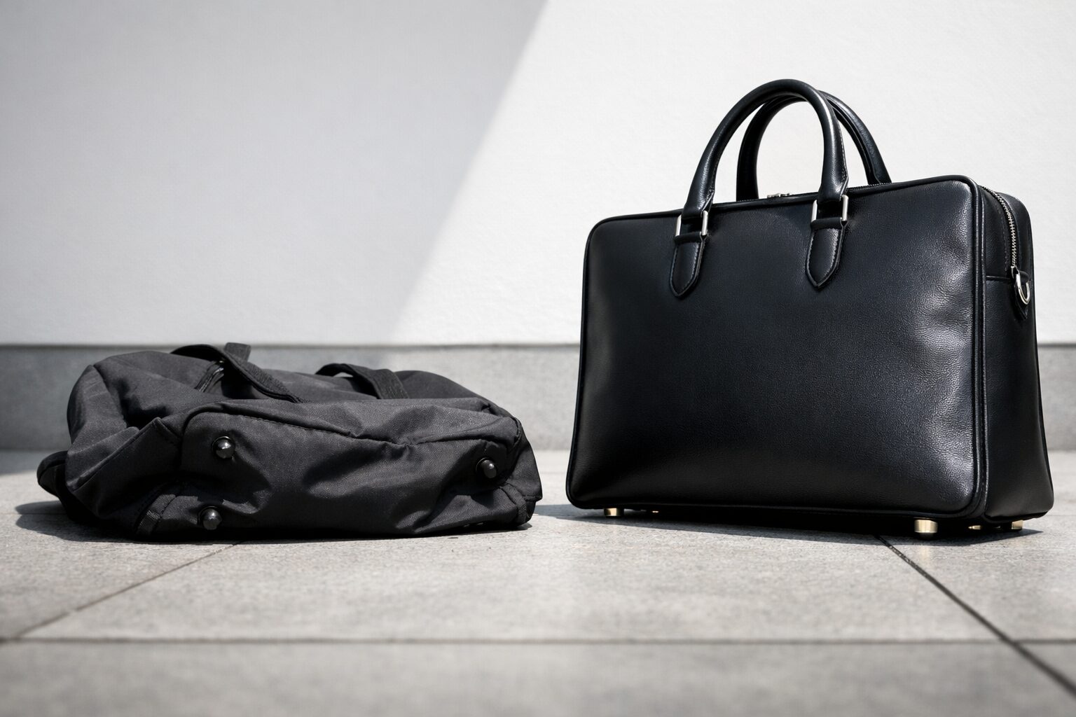 特に、ナイロン製の柔らかいカバンに重い荷物を詰め込み、長いベルトで吊るしてしまうと、カバン自体がV字に型崩れを起こします。この「形が崩れた状態」こそが、だらしなさや疲労感を感じさせる一番の原因です。美しいスーツのシルエットを損なわないためには、カバン自体の形状記憶力と持ち方が重要になります。