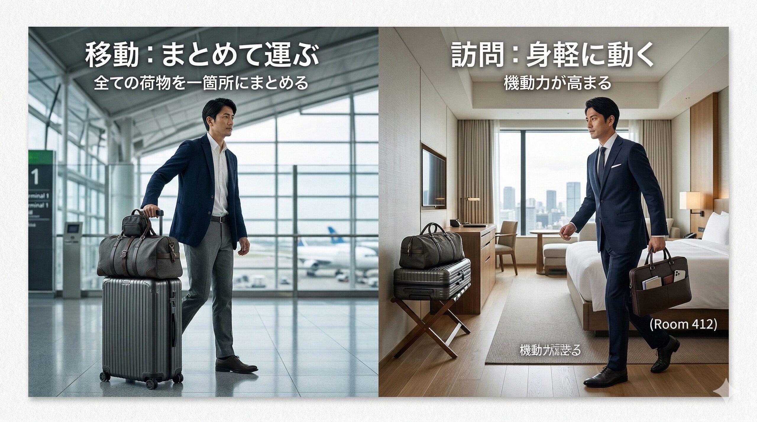 普段の通勤だけでなく、長距離の移動を伴う出張の際にも、カバンの2つ持ちスタイルは非常に大きな効果を発揮します。