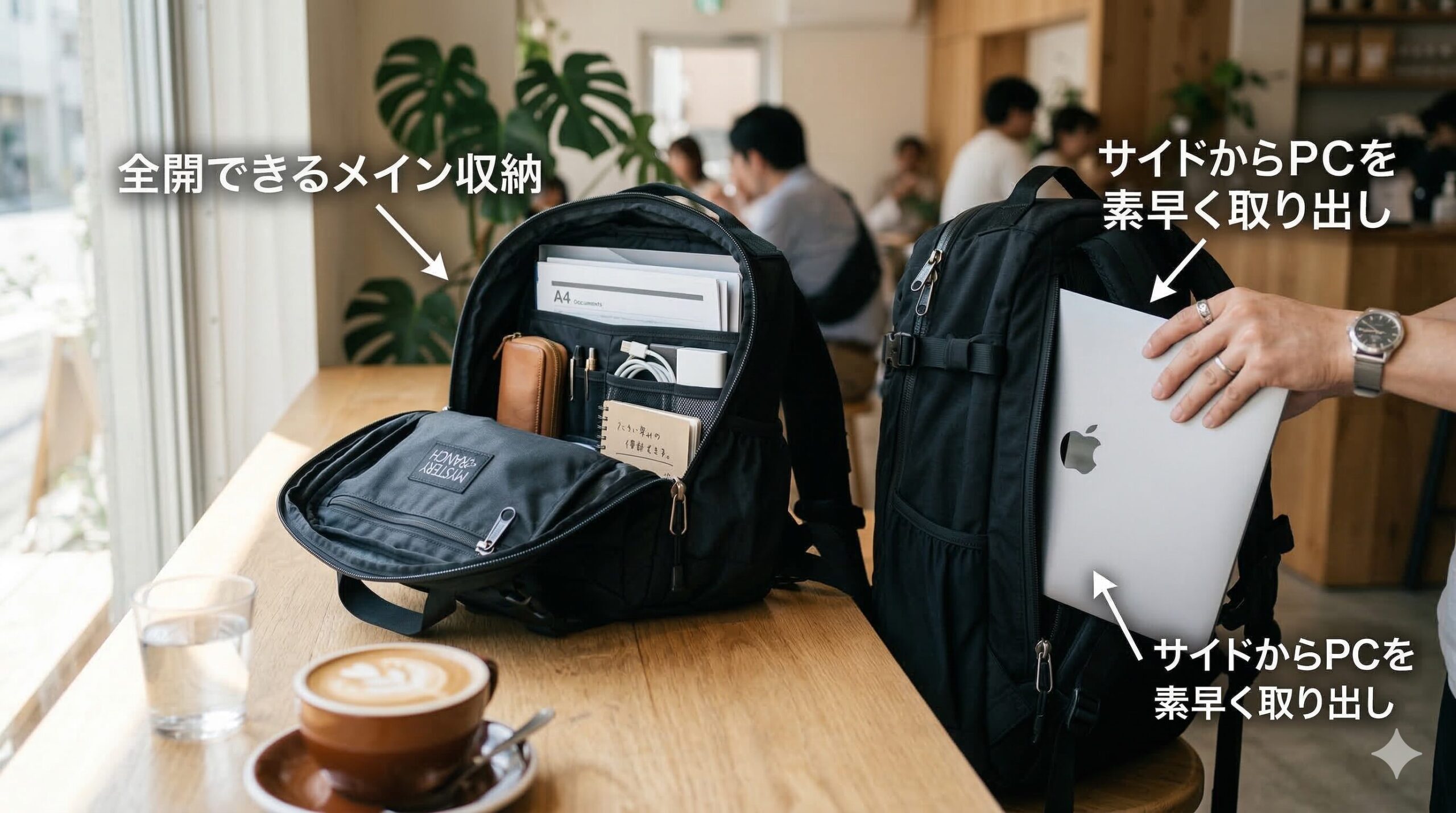 メインの3ジップを開けることなく、背中側からスッとノートパソコンやタブレットを取り出すことができるため、カフェや空港の保安検査場での動作が劇的にスマートになります。