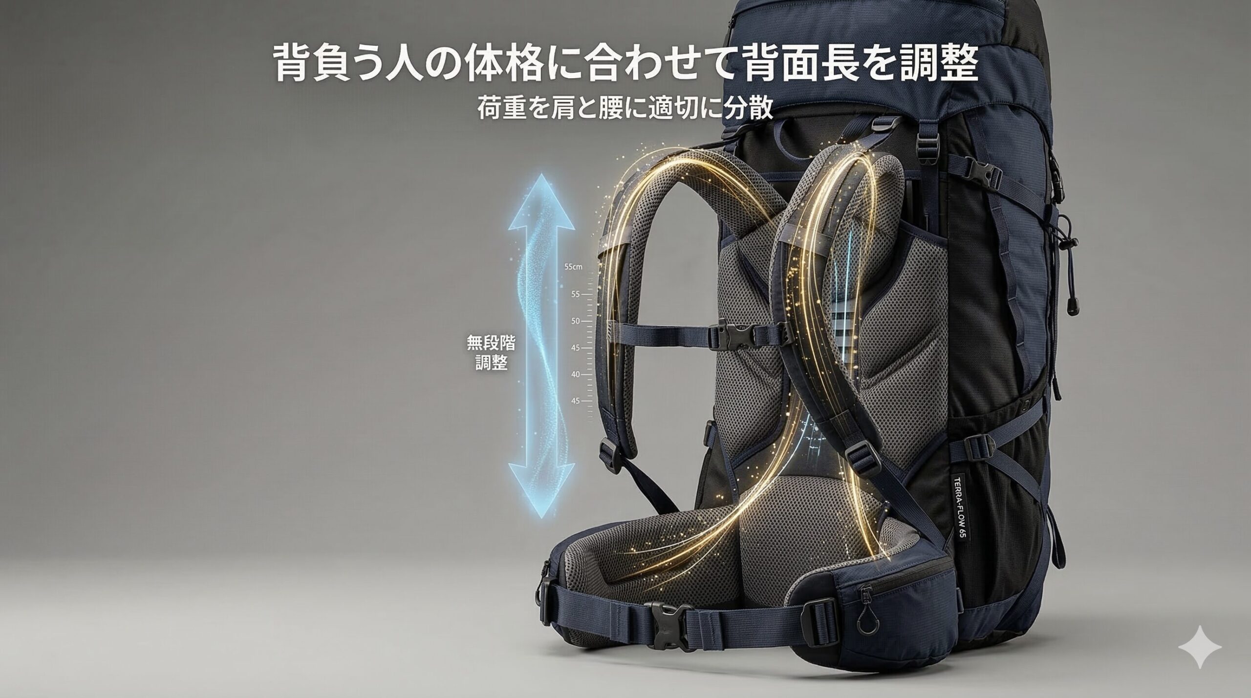 背面の長さ(フューチュラヨークシステム)を自分の背中に合わせて無段階で調整できるため、重い荷物を背負って険しい山道を歩いても、驚くほど疲れにくいというメリットがあります。