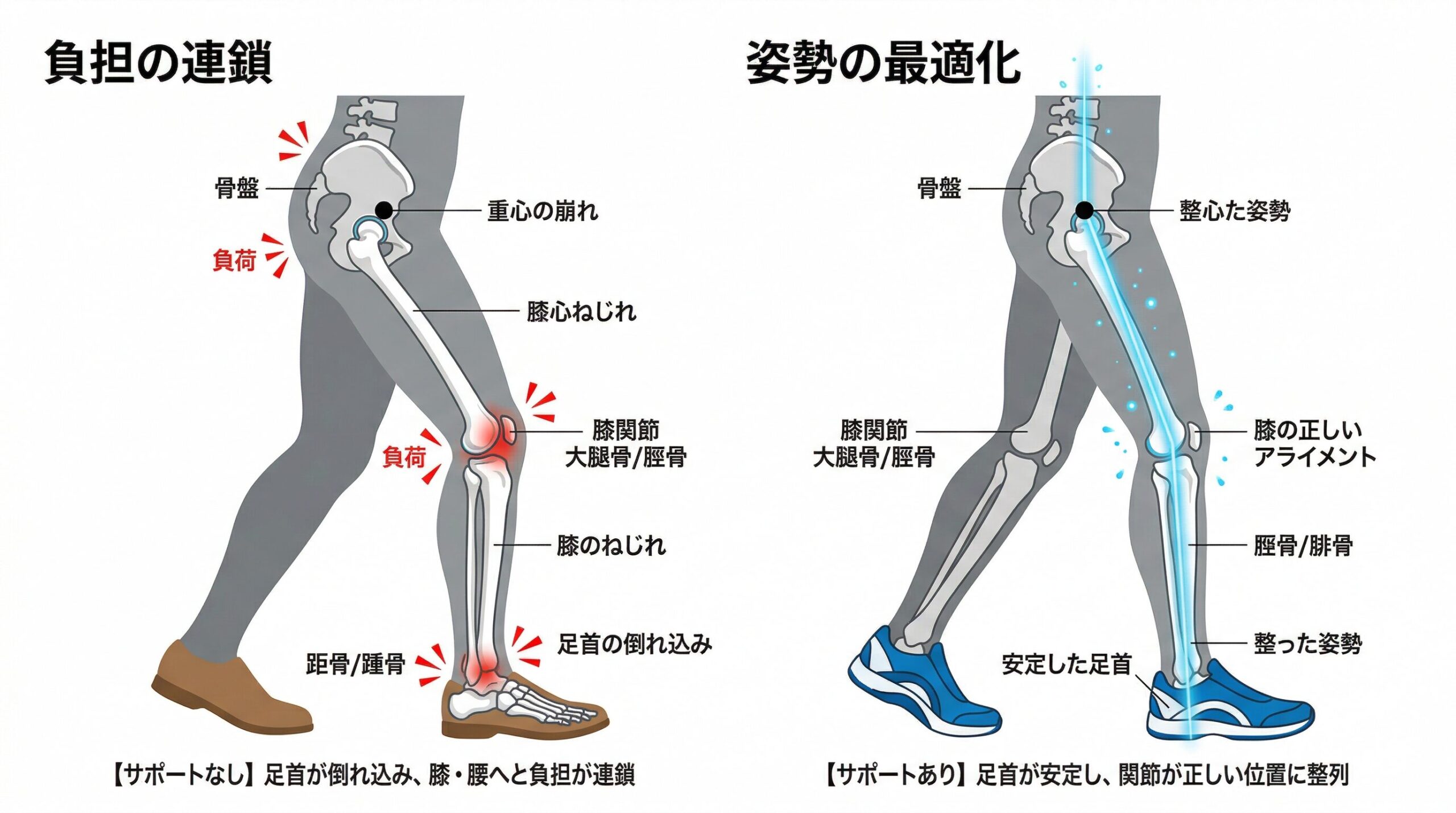 このように、医療的なアプローチからスタートしているため、足首から膝、腰への負担を連鎖的に軽減する構造が確立されています。