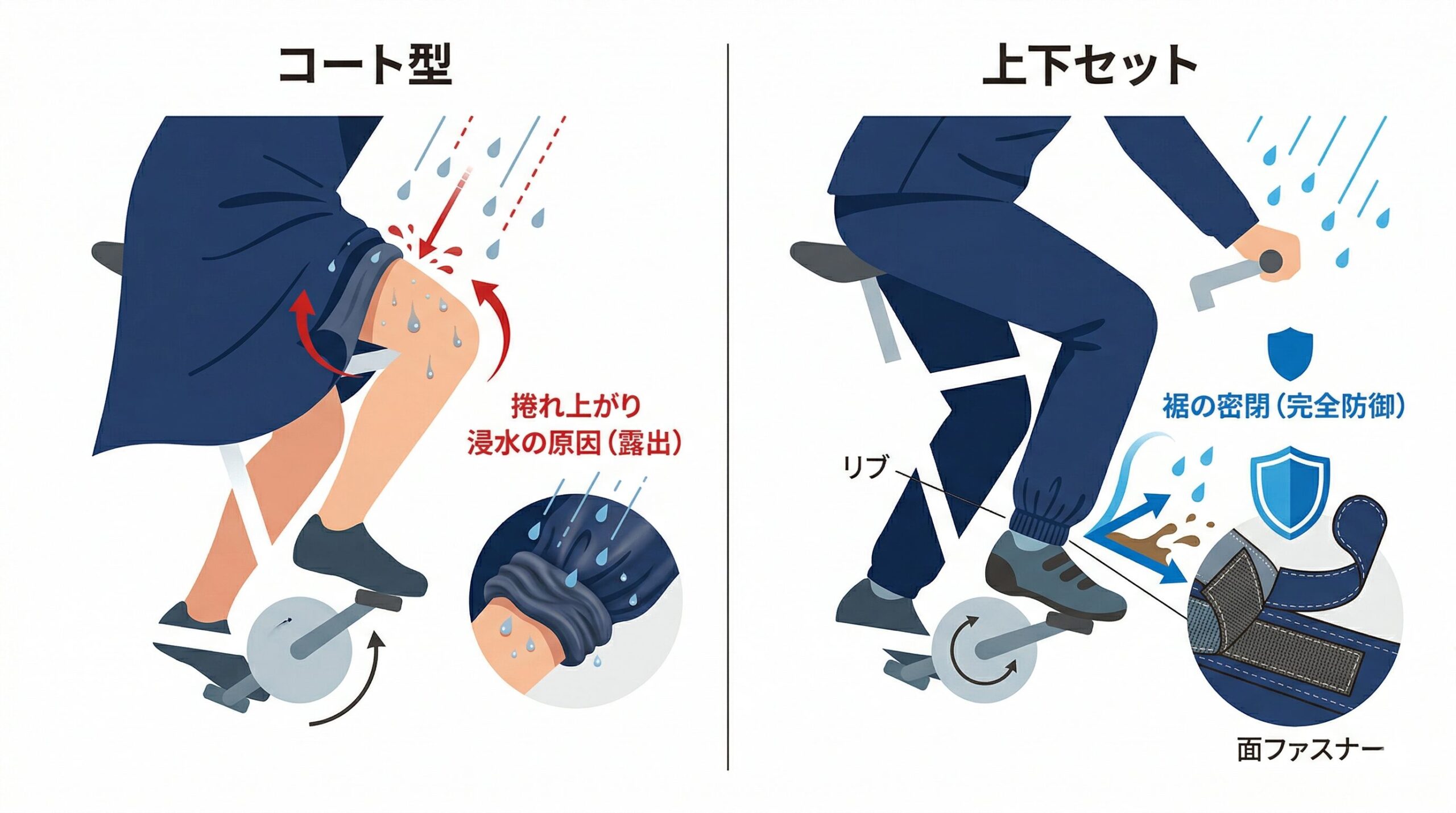 - ズボンや靴を守る:足元が濡れない上下セットの優位性と服装