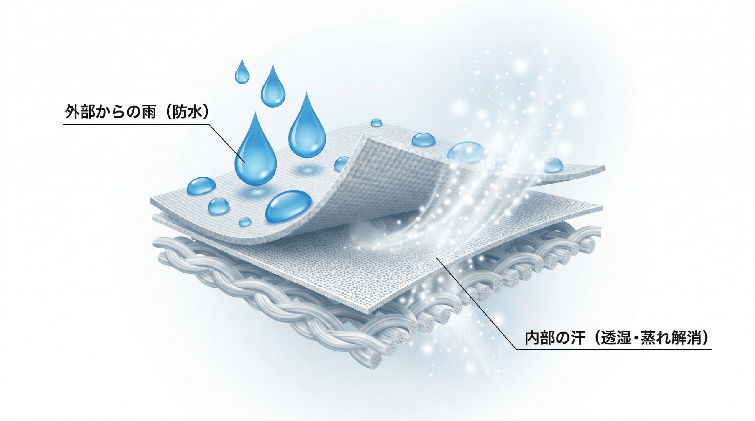 透湿性とは、衣服内の水滴にならない蒸気状態の汗を生地が外に出す度合いのことで、24時間に何グラムの水分を外に出すのか、ということを数値で表しています。透湿性のある合羽の素晴らしいところは、雨・風などの外気はシャットアウトしつつ、内側の水蒸気は外に出すという点です。