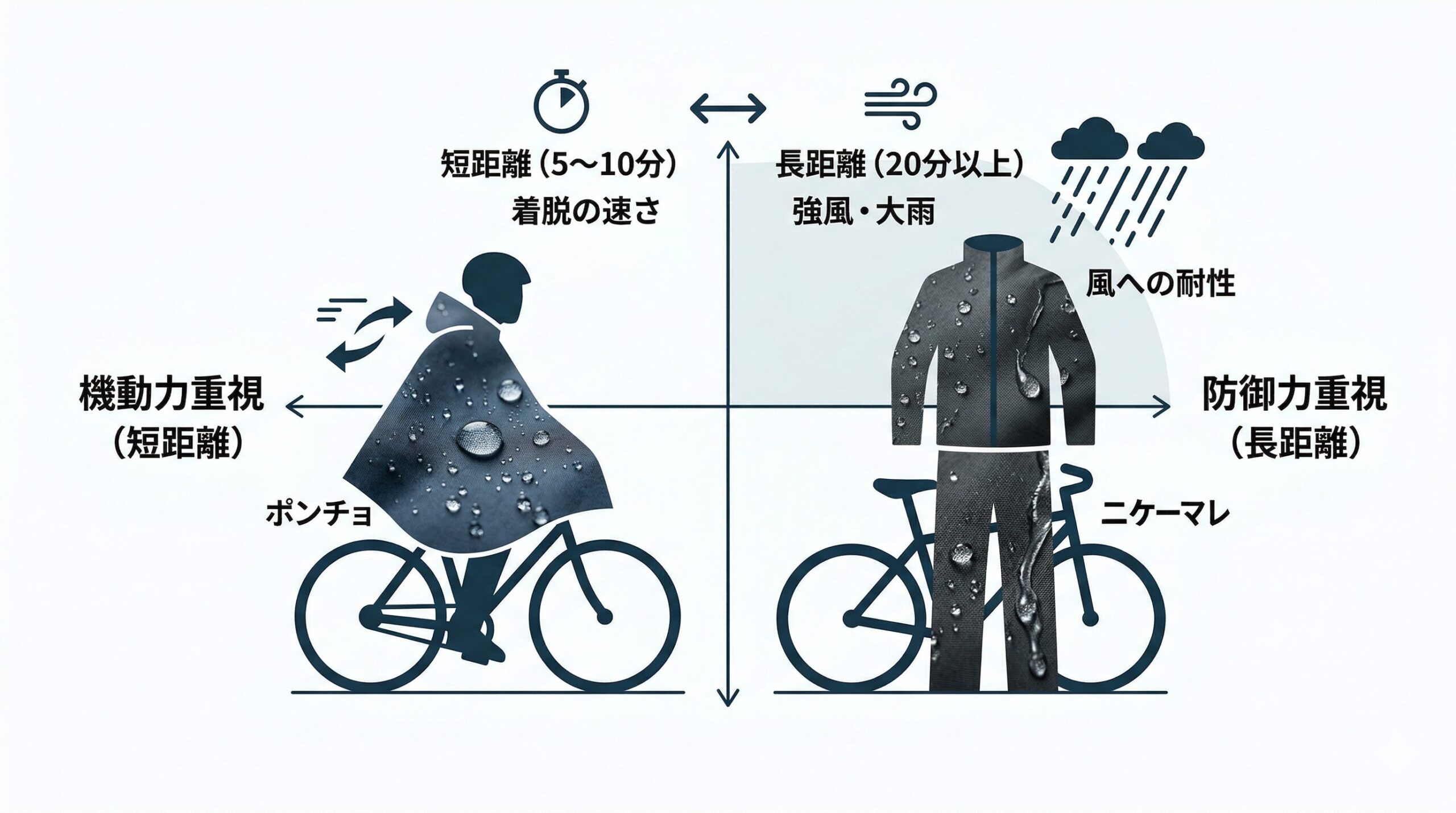 日常的な移動距離や着脱の手間を考慮すると、数分程度の短距離移動には被るだけで済むポンチョが適しています。一方で、長距離や風の強い日には身体に密着するセパレート型のレインコートが最適です。