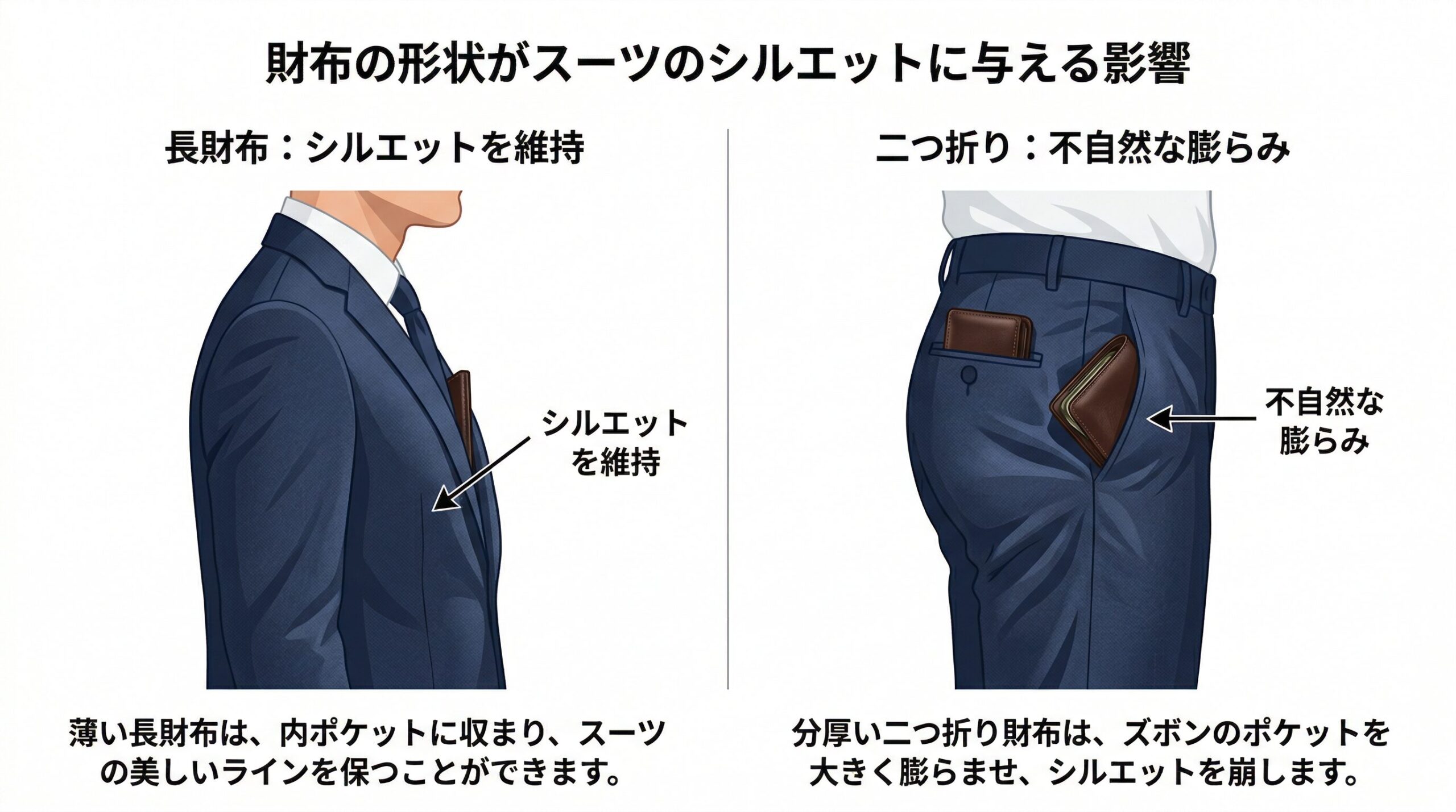 ビジネスシーンにおいて相手に洗練された印象を与えたい場合、長財布の持つフォーマルな雰囲気は大きな武器となります。特にスーツの胸ポケットや鞄に忍ばせる場合、厚みの出にくい薄型の長財布はスーツのシルエットを崩さないという決定的な利点があります。