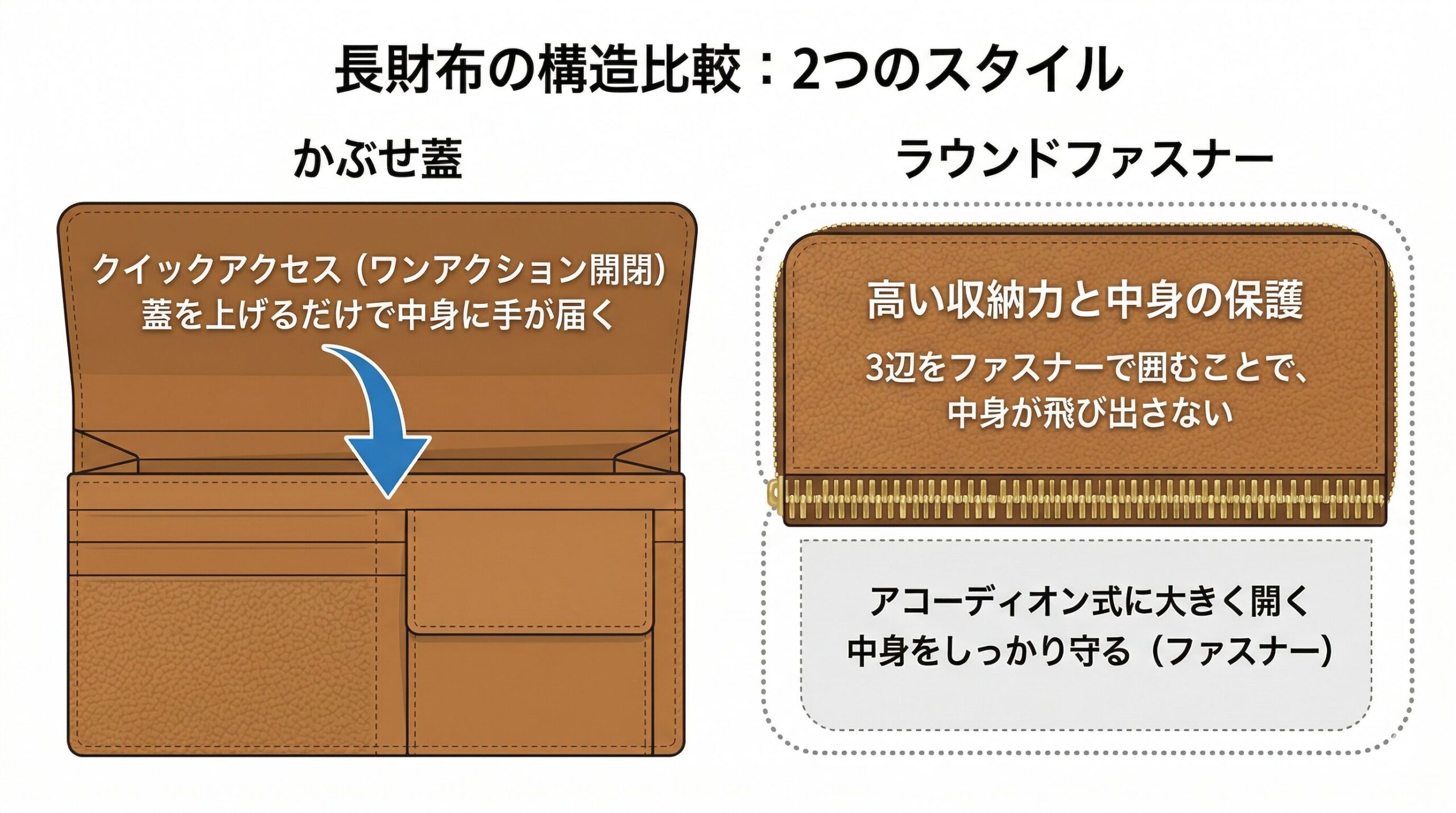 長財布の形状選びにおいて、ファスナーなしのスマートなかぶせ蓋か、ラウンドファスナーかで悩むケースは少なくありません。かぶせ蓋はワンアクションで紙幣やカードにアクセスできる無駄のなさが魅力であり、スーツスタイルに最もよく似合います。