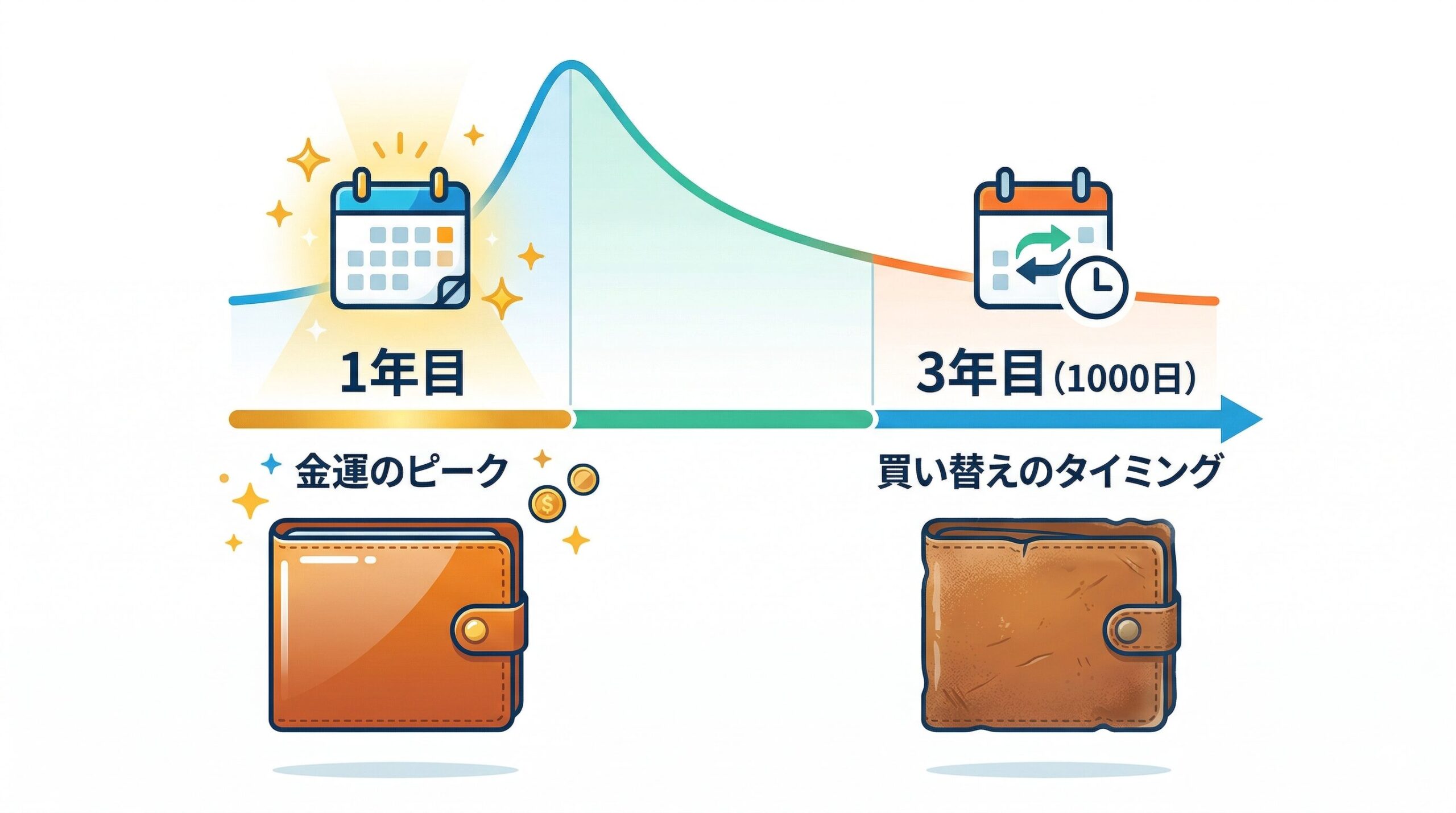 風水では1000日(約3年)が財布の寿命とされており、3年経つと徐々に金運を呼び込む力が弱まっていくと考えます。
