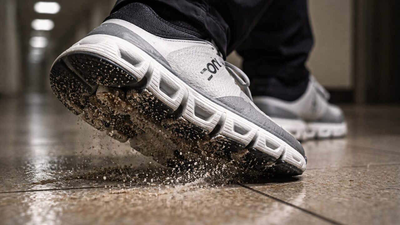 雨の日や、清掃されたばかりの商業施設の床、あるいは病院の廊下などで、急にスニーカーが鳴き出すことがあります。これは水分やワックスが介在することで、ゴム製のアウトソールと床材との間で「スティックスリップ現象」と呼ばれる振動が発生するためです。特に濡れた状態のアウトソールは、乾いた床に入った瞬間に強力なブレーキがかかりやすく、大きな音が出ます。これはOnスニーカーに限らず、ゴム底の靴全般で起こりうる物理現象です。