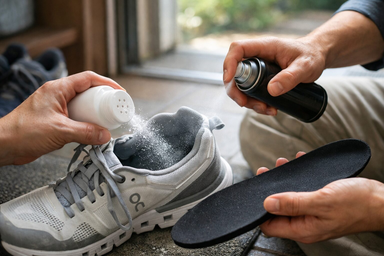 この内部からの音鳴りに対する特効薬として知られているのが「ベビーパウダー(またはフットパウダー)」です。方法は非常に簡単で、一度インソールを取り外し、靴の中底部分とインソールの裏側にパウダーを薄く振りかけるだけです。微細な粉末が潤滑剤の役割を果たし、素材同士の摩擦を劇的に軽減してくれます。パウダーがない場合は、シリコンスプレーを薄く塗布したり、マスキングテープや布ガムテープを擦れる部分に貼って直接接触を防いだりする方法も有効です。Onスニーカーのようにインソールが取り外せるタイプであれば、数分で完了するこの対策で嘘のように音が止まることが多いので、ぜひ試してみてください。